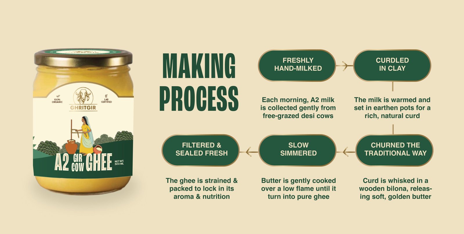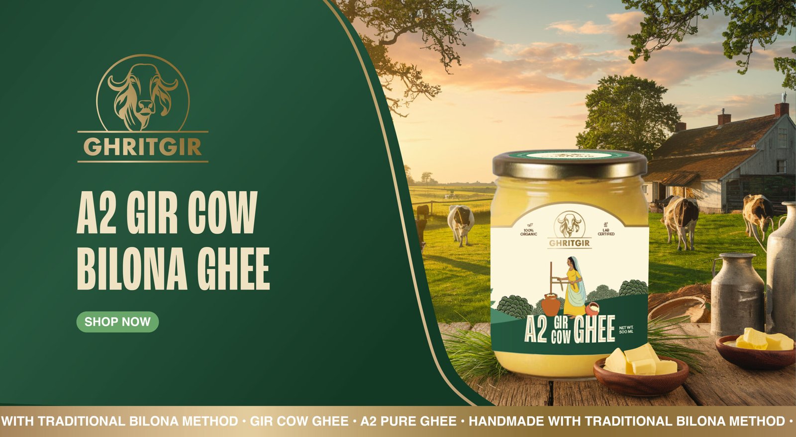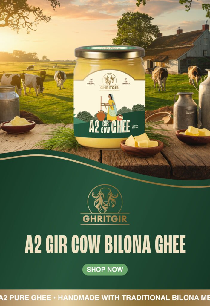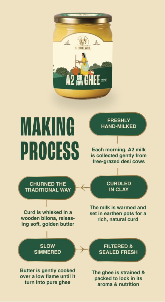 Ghritgir A2 Bilona Ghee is a luxurious, nutrient-rich ghee crafted from the milk of pure, free-grazing Gir cows that roam untied in open pastures. Using the traditional Bilona method, we churn curd in a wooden churner to separate the butter, which is then gently simmered over a slow flame. This artisanal process preserves the ghee’s golden hue, rich aroma, and powerful nutrition.